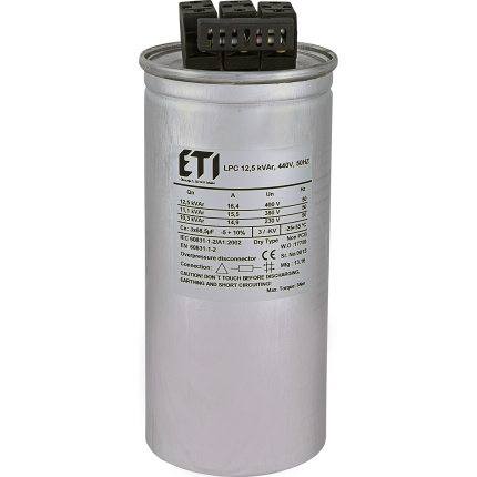 258.00lei TVA inclusCondensator 12,5kVAr, Tip Uscat, 440V, 50Hz, Capacitate 3×68.5Uf, 004656761, ETI