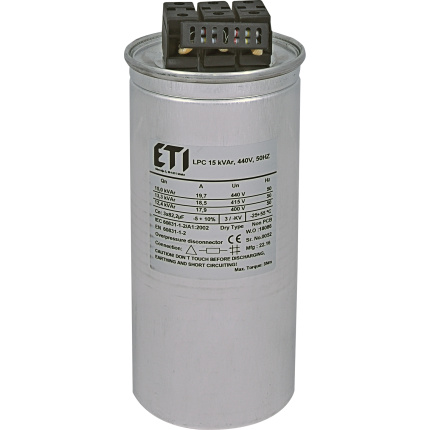 292.50lei TVA inclusCondensator 15kVAr, Tip Uscat, 440V, 50Hz, Capacitate 3×82.2Uf, 004656762, ETI